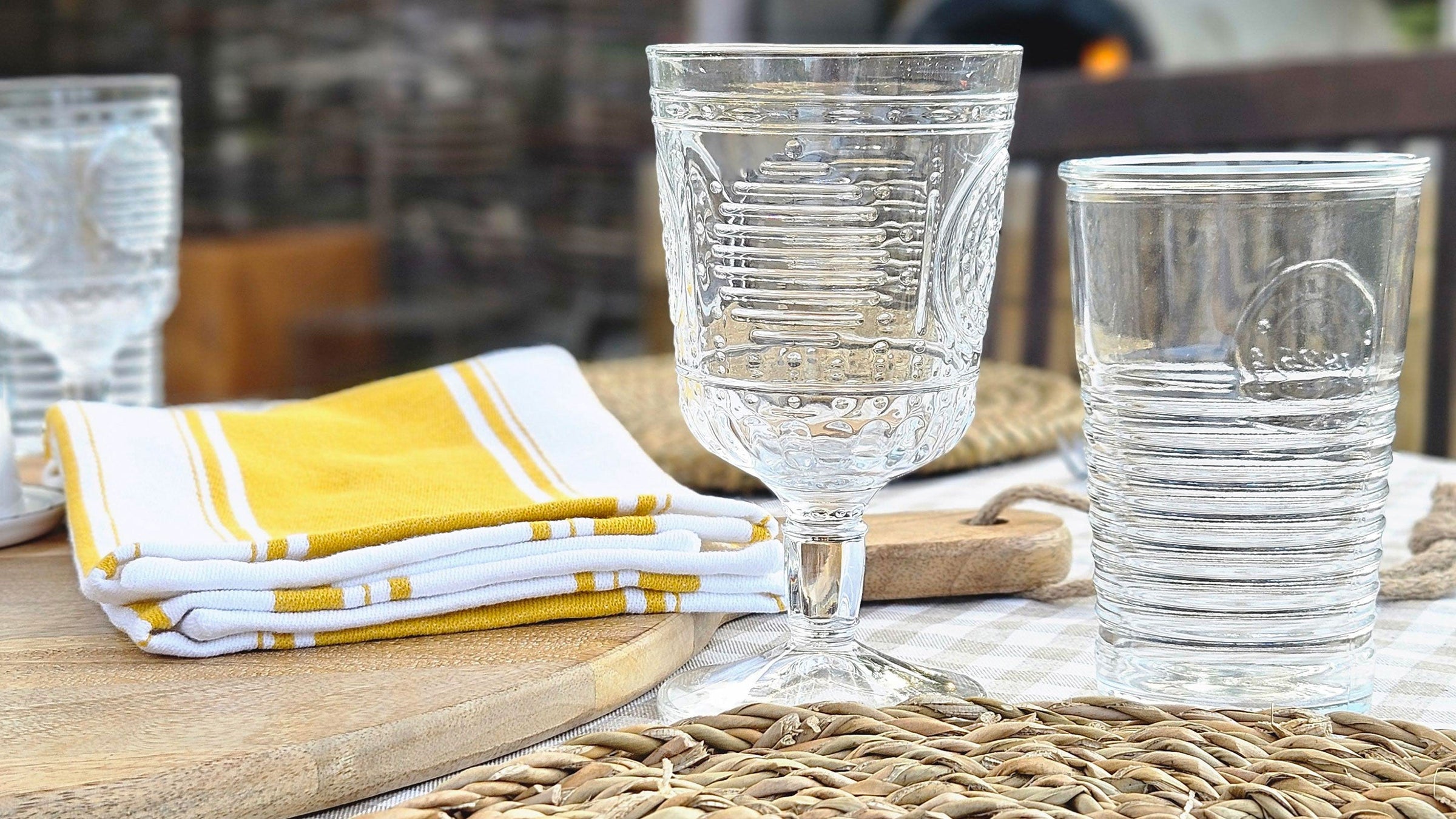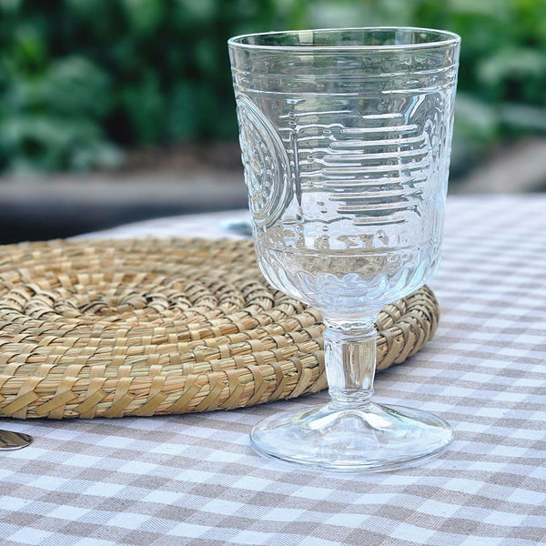 Italian wine glass on a table covered with green gingham tablecloth  and fresh vegetables.