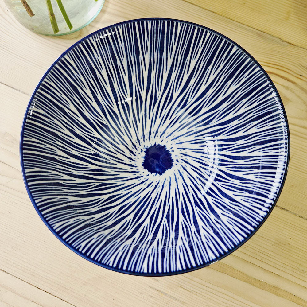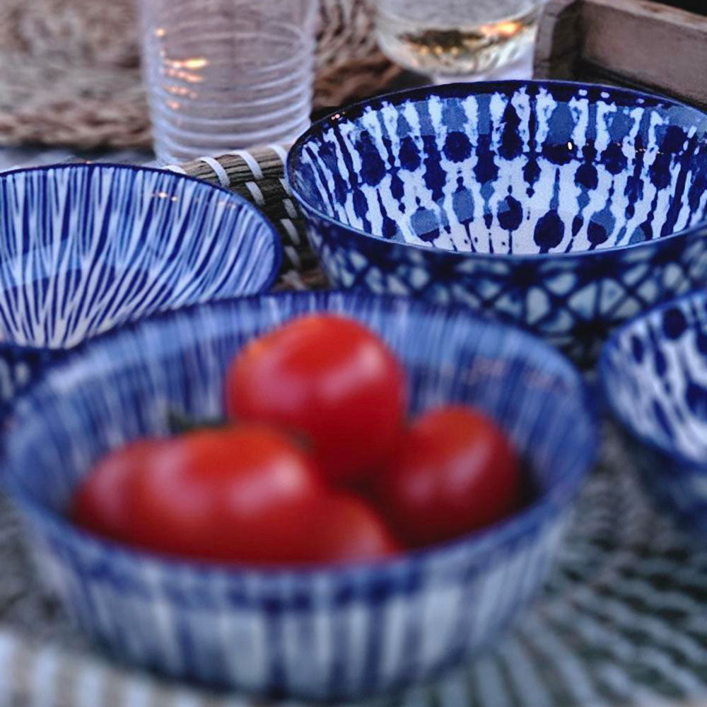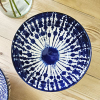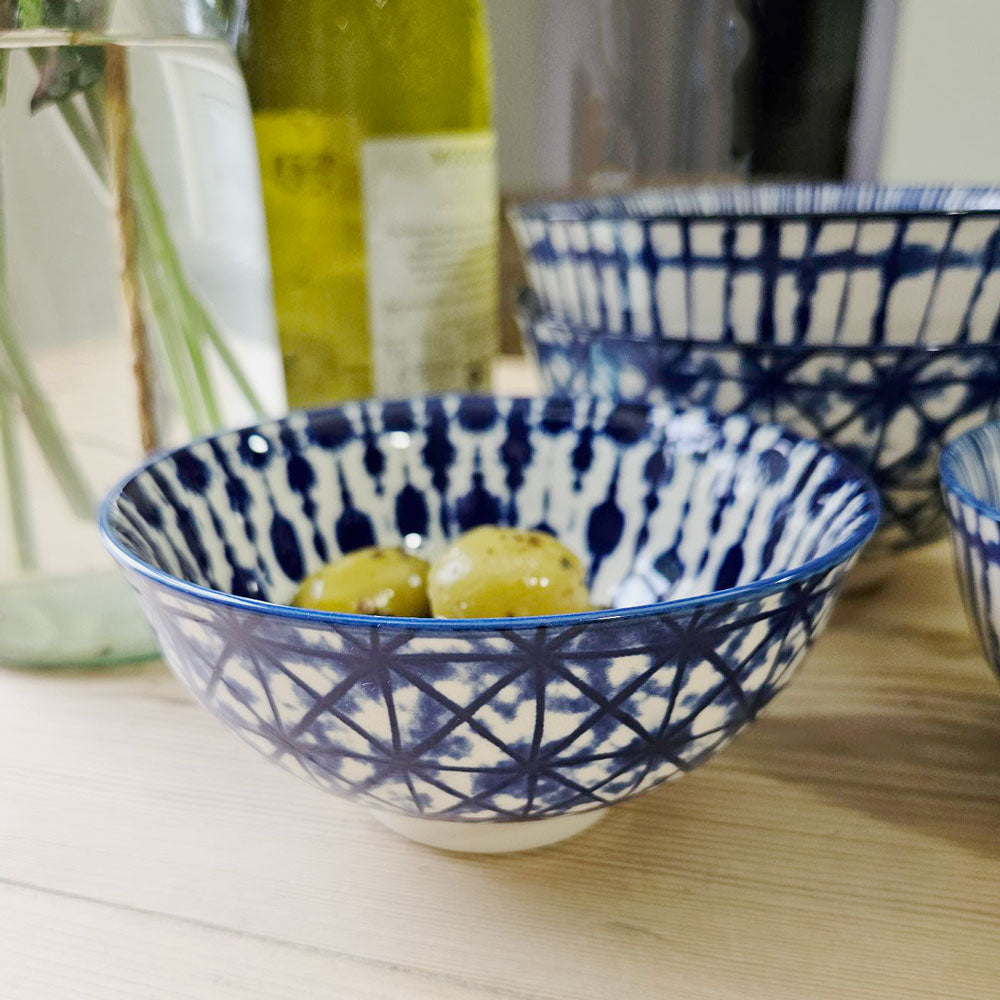 The Blue Ikat Serving Bowl is the ideal nibbles bowl. Beautifully made, the ceramic bowl has a pretty Ikat design and is finished with a rich glaze. A lovely serving dish that is the perfectly sized tapas bowl. Available in a choice of two sizes and two designs, perfect tableware for dining inside or out. Suitable for serving all foodstuffs, not microwave safe. Hand wash only.