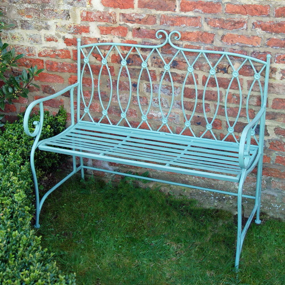 Pretty green metal garden bench. Elegant design taken from an antique original with gothic style detailing and subtle sea green powder coated finish. A lovely classic design perfect for a small courtyard garden. Seats two, requires straight forward self assembly.