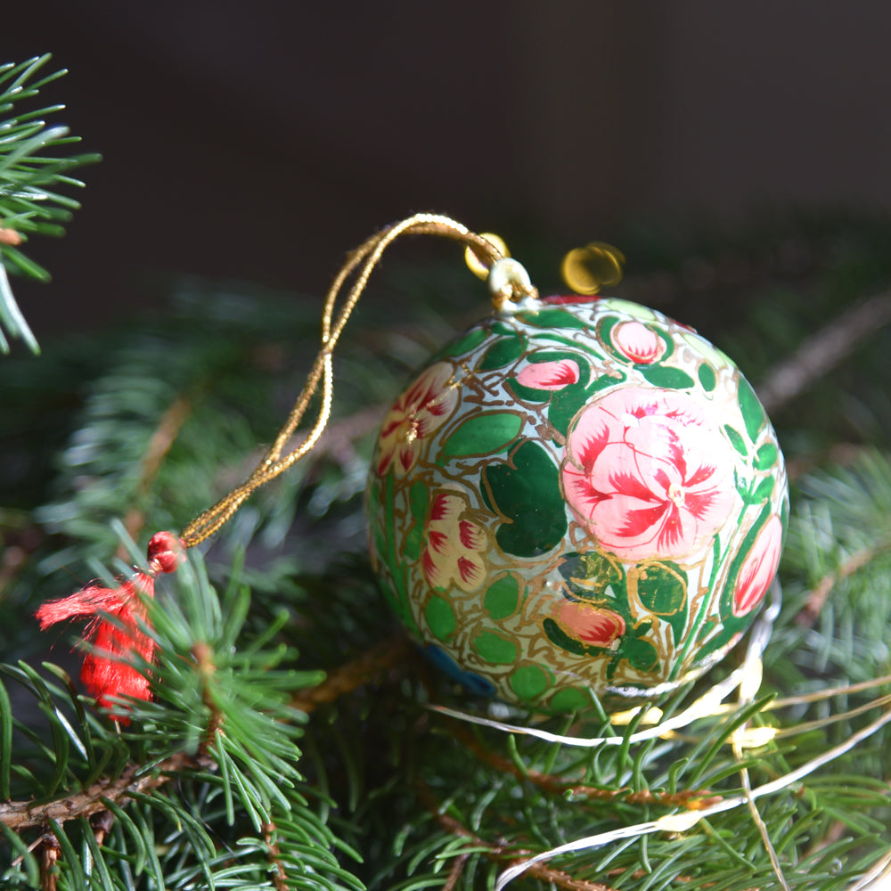 Hand-painted Folk Christmas tree bauble, painted by artisan craftspeople in India. An exquisite Christmas tree decoration made from papier mache and delicately decorated with a rich floral design over a pretty turquoise colour. Each bauble is individually made and hand finished with a gold hanging loop and tassel to the top. These folk-style decorations look beautiful on the tree or from birch twigs for a contemporary look