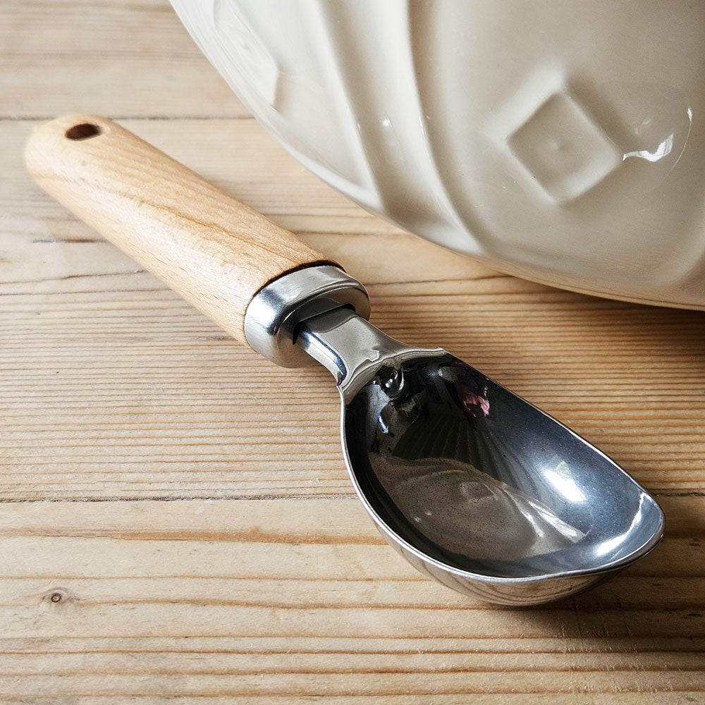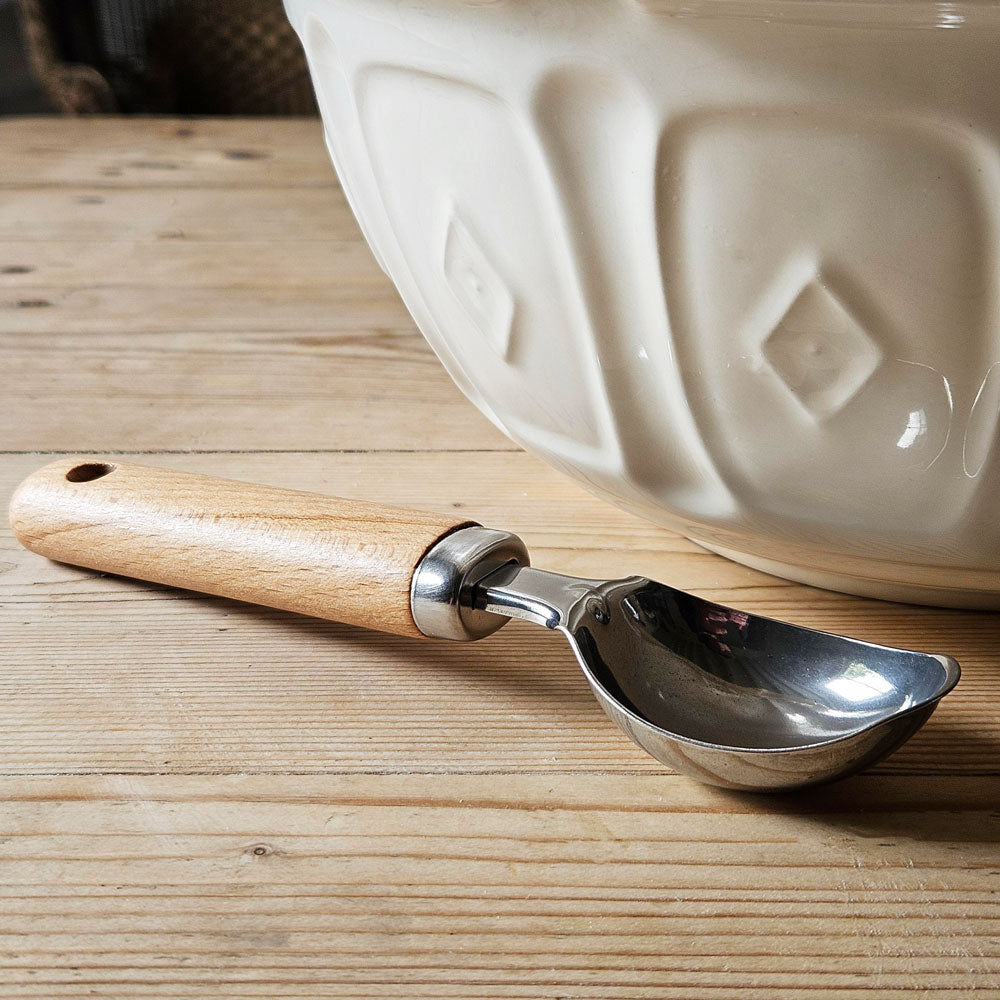 An ice cream scoop from our range of kitchenware. A beautifully constructed stainless steel ice cream scoop with a beechwood handle. A well designed kitchen utensil that scoops ice cream into a small ball. An essential piece of kitchenware.