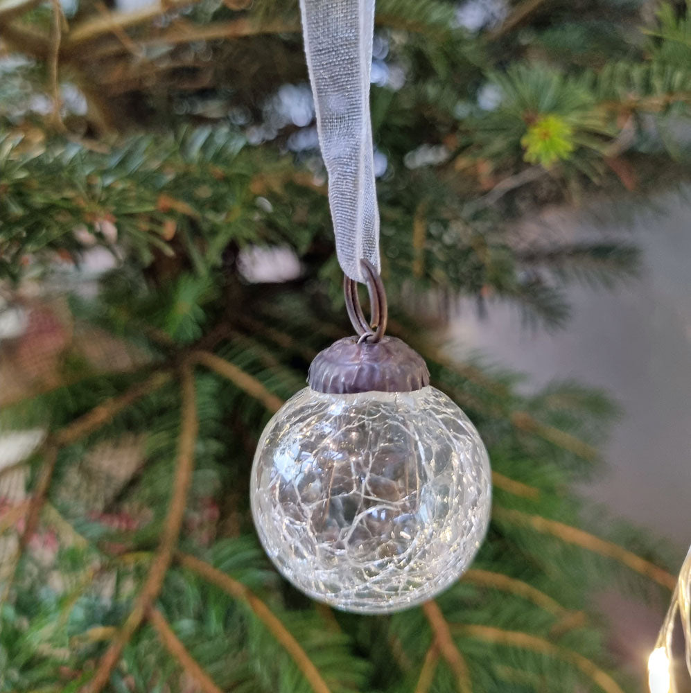 Vintage crackle glass bauble from our range of handmade crackle glass Christmas tree decorations. A classic vintage inspired glass bauble, this round design is from a wider selection of antique style glass tree decorations which are perfect for creating window and ceiling displays. Beautifully made with antique style cap and organza ribbon.