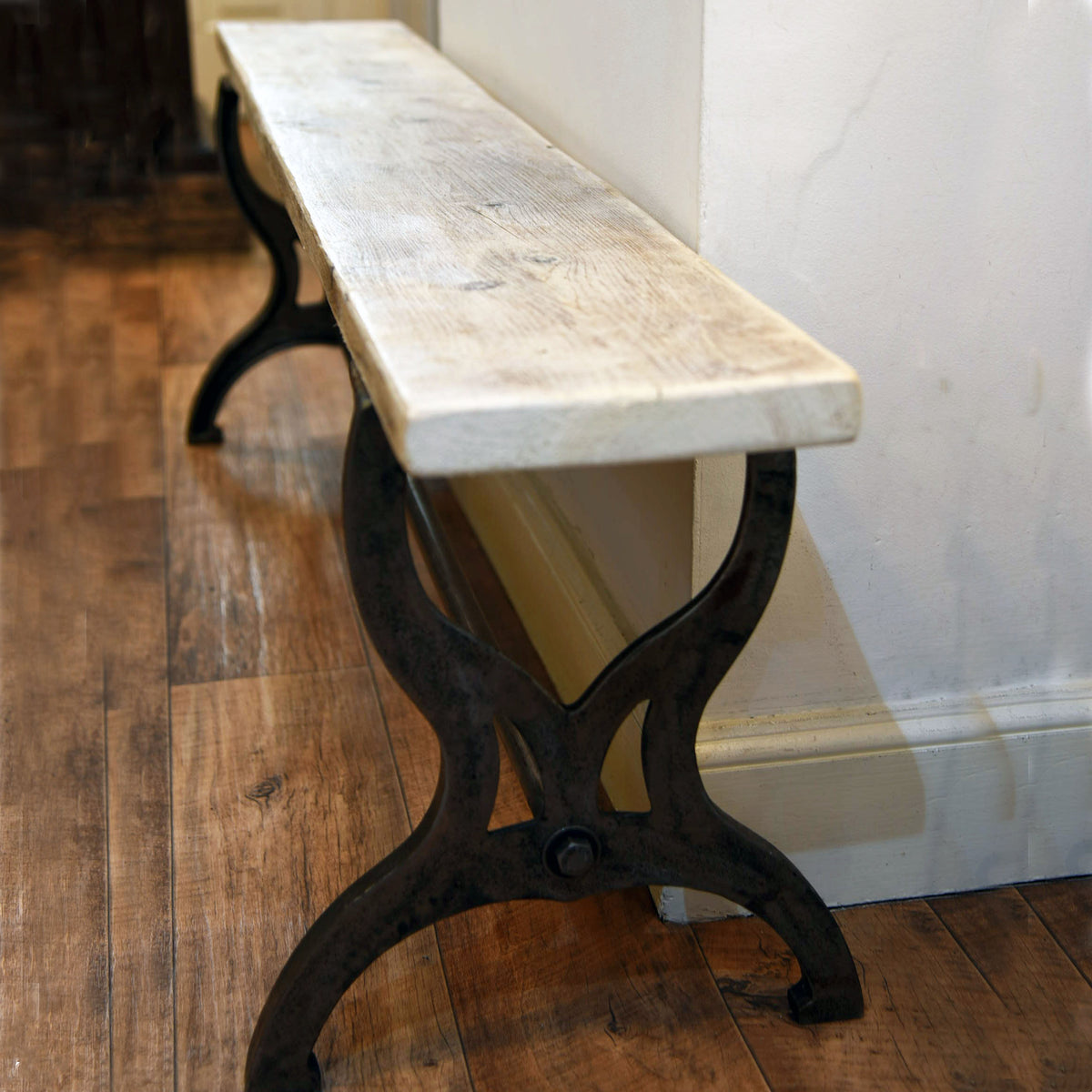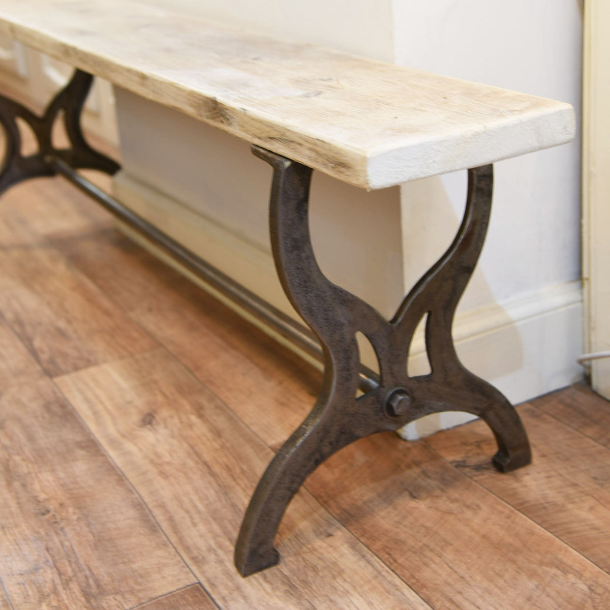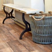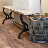 The Malvern bench features a reclaimed timber top on a wrought iron base. This simple piece of furniture will sit easily with any style of décor including Modern farmhouse, vintage inspired interior design or contemporary design. The wrought iron base is inspired by an antique original, the two sturdy cast iron bench ends feature handsome design details and a cast iron rod connects the the two ends to further strengthen the base. The salvage top is finished by to give a smooth durable top with nicely rounded corners and a protective wax applied to seal the wood.