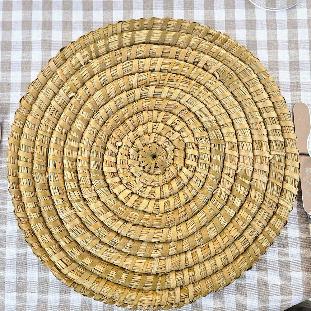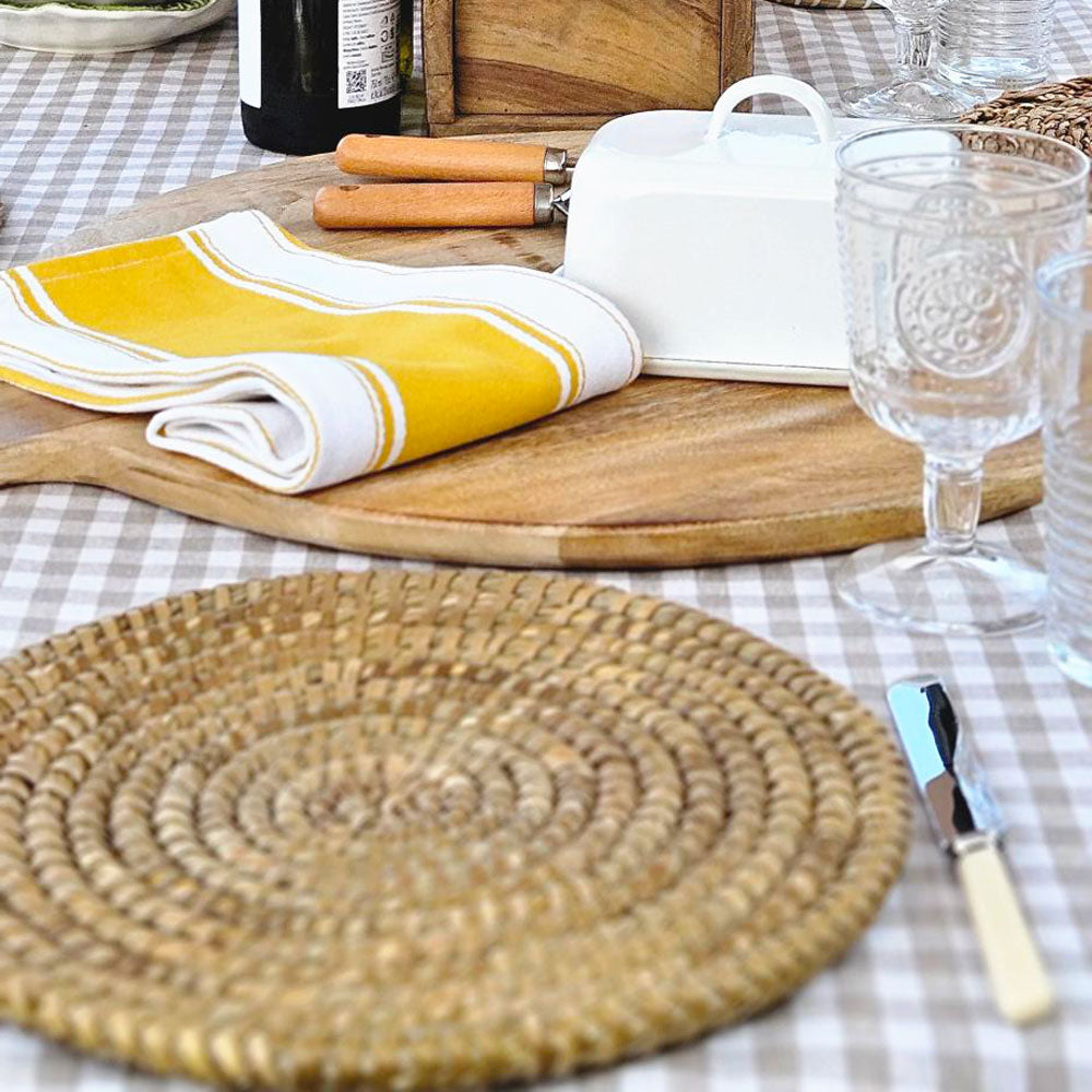 Round woven placemat, a natural table mat made from sustainable palm leaf. The natural finish of this round placemat will compliment relaxed tableware perfectly and will protect surfaces from spills, damage and hot dishes.
