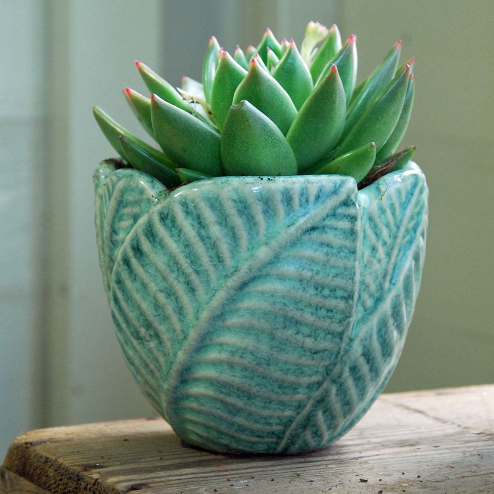 Perfect for the resurgence in house plants or kitchen windowsill herbs these beautifully designed plant pots resonate with retro design. Made from terracotta with lovely leaf shaped detailing and finished with a subtle green glaze. These look lovely planted with succulents and are a lovely house warming gift. Available in three sizes.