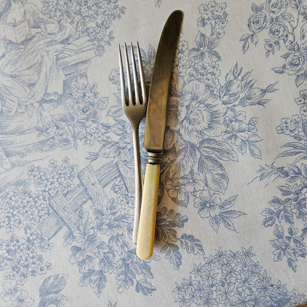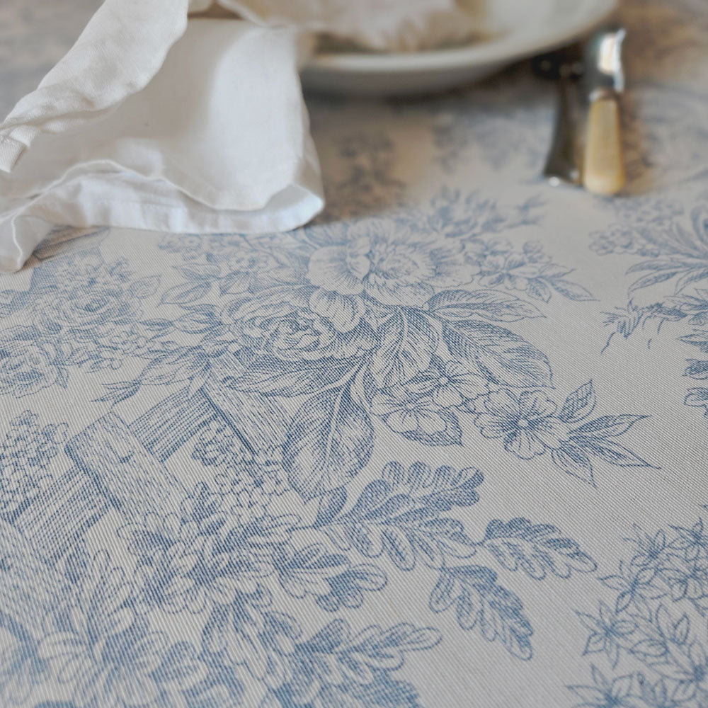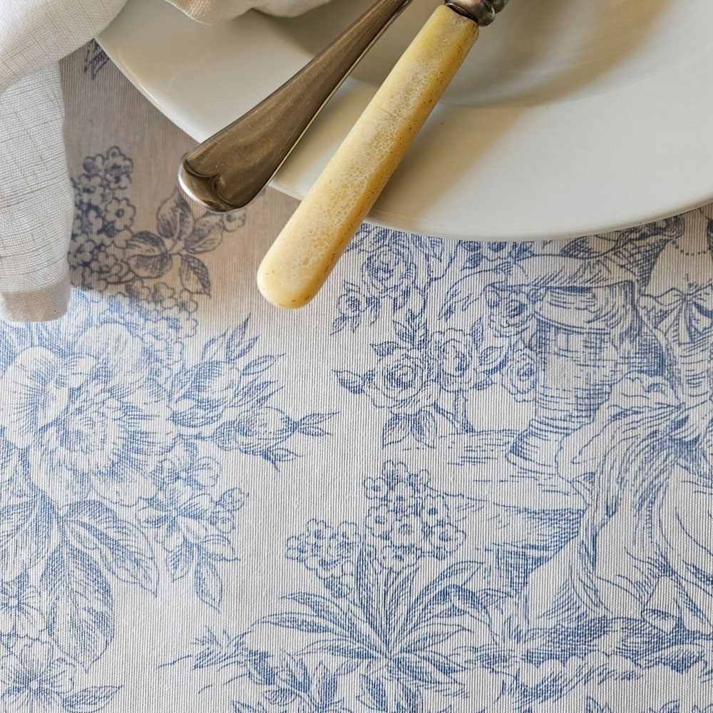 Toile de jouy wipe-clean tablecloth. A classic and elegant toile de jouy print from our range of wipeable cloth tablecloths. The pretty, blue, wipeable tablecloth offers a practical yet stylish alternative to traditional PVC tablecloths and plastic tablecloths. Our oilcloth tablecloth has the same soft drape as a linen tablecloth, as well as a low sheen surface to give the impression of a tablecloth but offering the practicality of a wipe-clean tablecloth.
