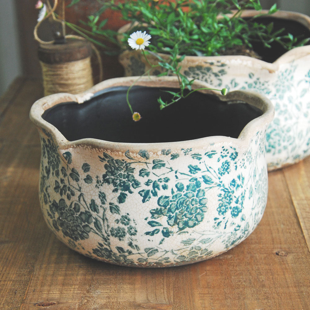 Wiverton Vintage Ceramic Plant Pot inspired by an original antique flower pot. The green plant pot is finished in the faded Wiverton print and is accentuated by the pretty crackle glazed finish. The large ceramic plant pot has an elegant piecrust rim that gives a lovely contrast to both foliage and flowers. Designed for use as an indoor planter, it is a perfect house plant pot or indoor herb planter and is a versatile indoor plant pot for all year round use.